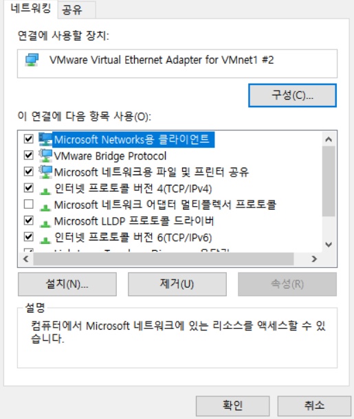 이더넷 2, 3번이 있는것을 확인할 수 있는데, 이더넷2를 클릭하여 속성에 들어가면, vmware bridge protocol이 보일것이다. 체크박스에 체크표시가 없다면 클릭해주도록 하자.