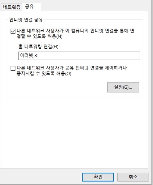 그 다음, 네트워킹 옆에있는 공유를 클릭하여 맨 처음에 나오는 체크박스를 클릭하도록 하자. 그리고 홈 네트워킹 연결을 이더넷 3로 설정해준다.