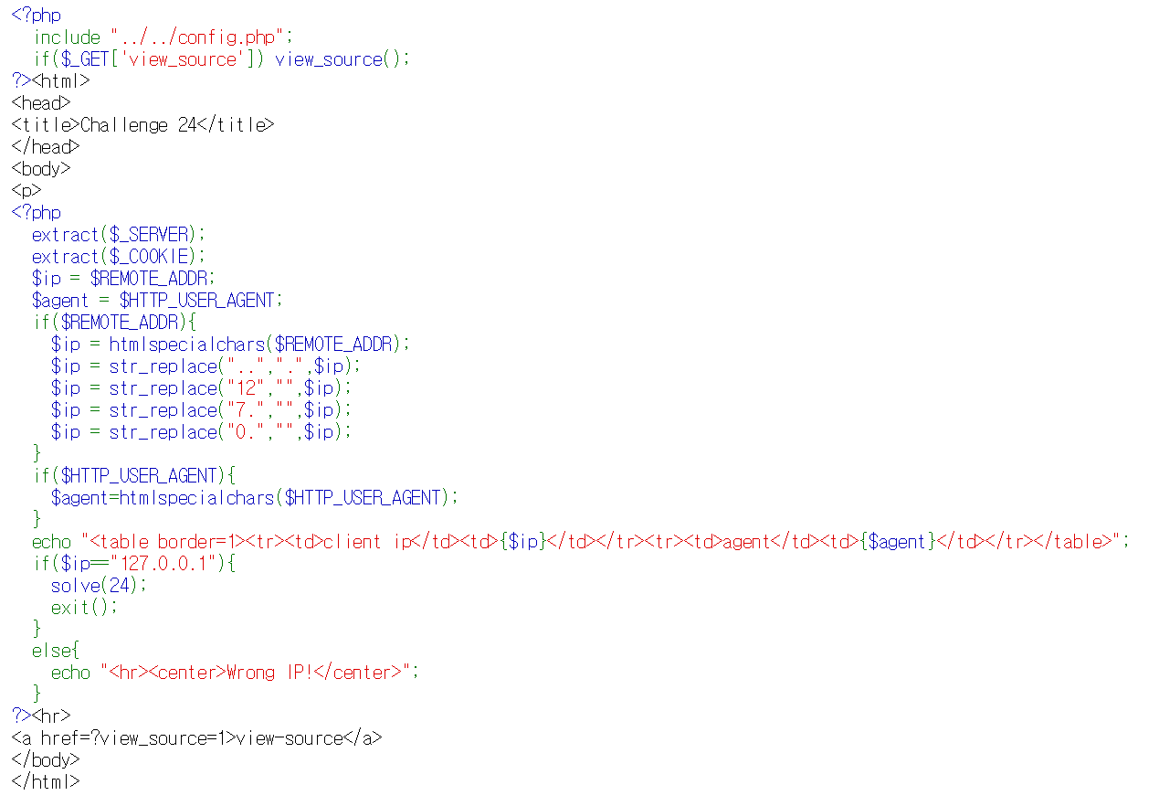 이것을 이용해서 사진의 코드를 해석해보면 ..은 .으로 '12', '0.', '7.'은 공백(스페이스의 의미가 아니라 정말 아무것도 적히지 않은 상태)로 대체된다. 이렇게 적힌 값이 $ip에 저장된다. 이때 ip의 값이 127.0.0.1일 경우 문제가 풀리게 된다.